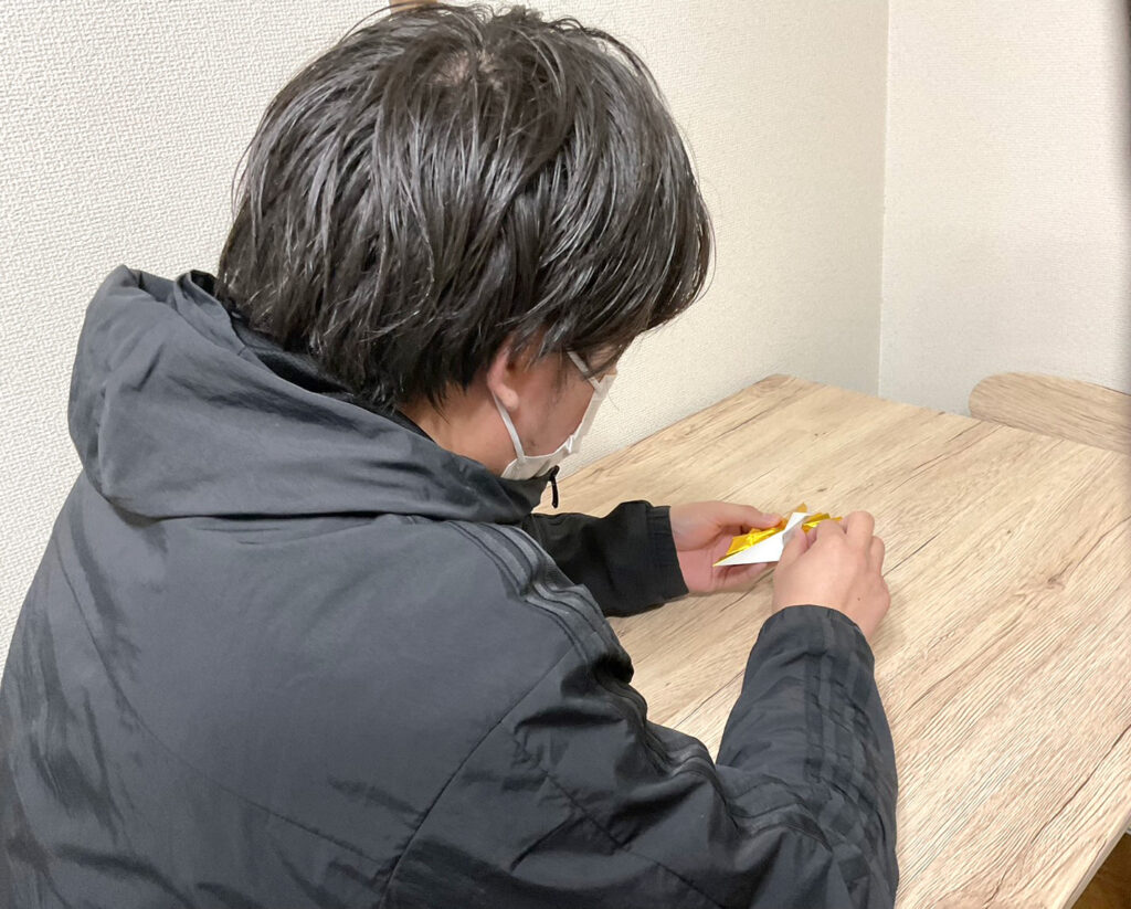 手先が器用なスタッフに手作りの折り鶴を教わったので、みんなで折っているところです🥳